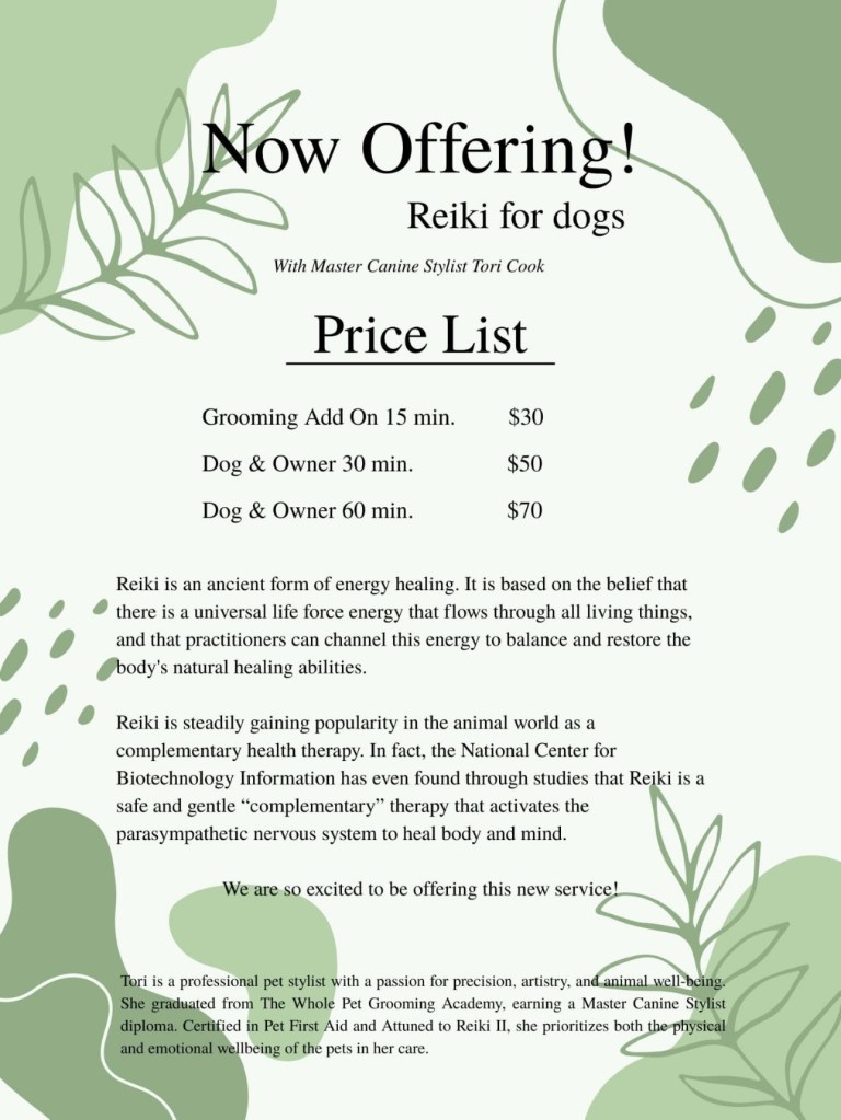 Reiki (pronounced ray-key) is a gentle, non-invasive energy practice that promotes balance and relaxation. Using light, intentional touch—or even hands held slightly above the body—Reiki helps clear energetic blockages and supports your dog’s natural ability to heal.